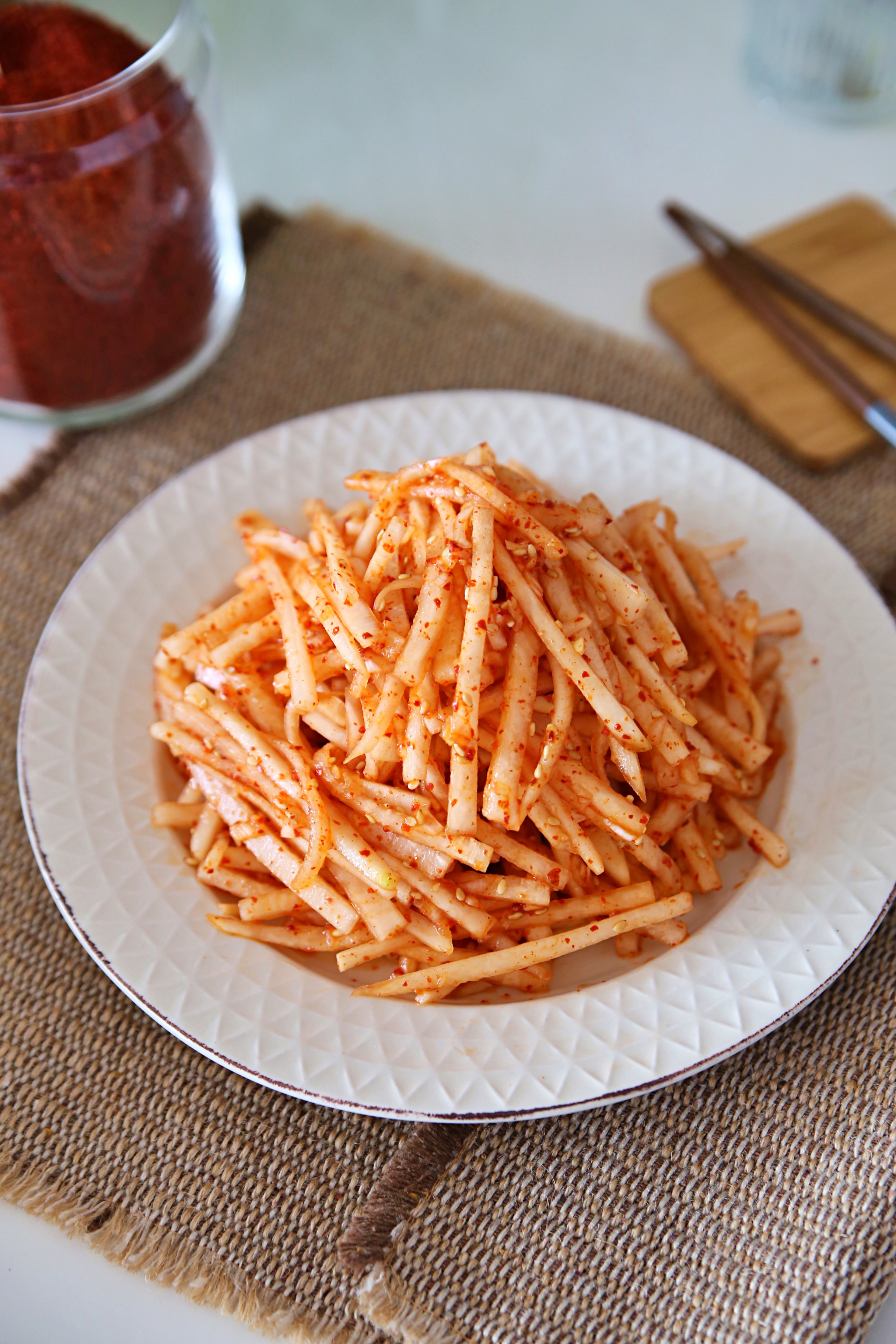 좋은 무를 골랐다면 다음은 손질 과정입니다. 무는 껍질을 너무 얇게 벗기면 흙 냄새가 남을 수 있으니 적당히 두께 있게 깎습니다. 그리고 깍두기처럼 정사각형 모양이 아닌, 조금 길쭉하고 먹기 좋은 크기로 썰어주면 양념이 더 잘 배어듭니다. 실제로 양념 흡수력을 고려하면 날카로운 칼로 단면이 매끈하게 나오도록 써는 것이 핵심입니다. 굳이 칼을 여러 번 왕복시키며 자르기보다 한 번에 힘 있게 써는 편이 훨씬 좋습니다.