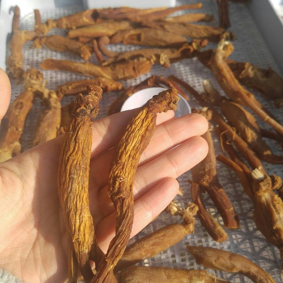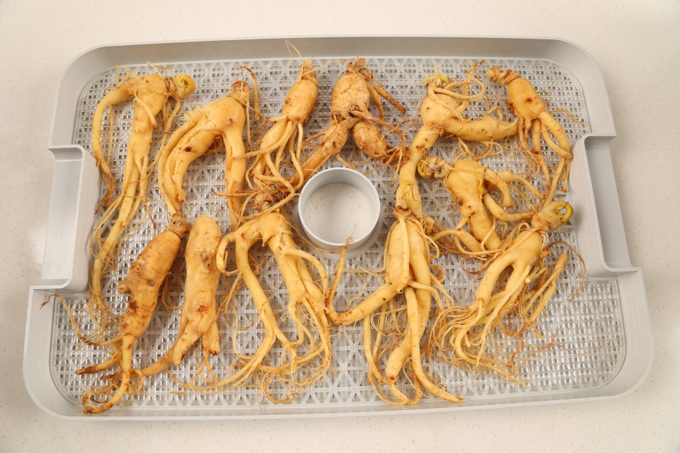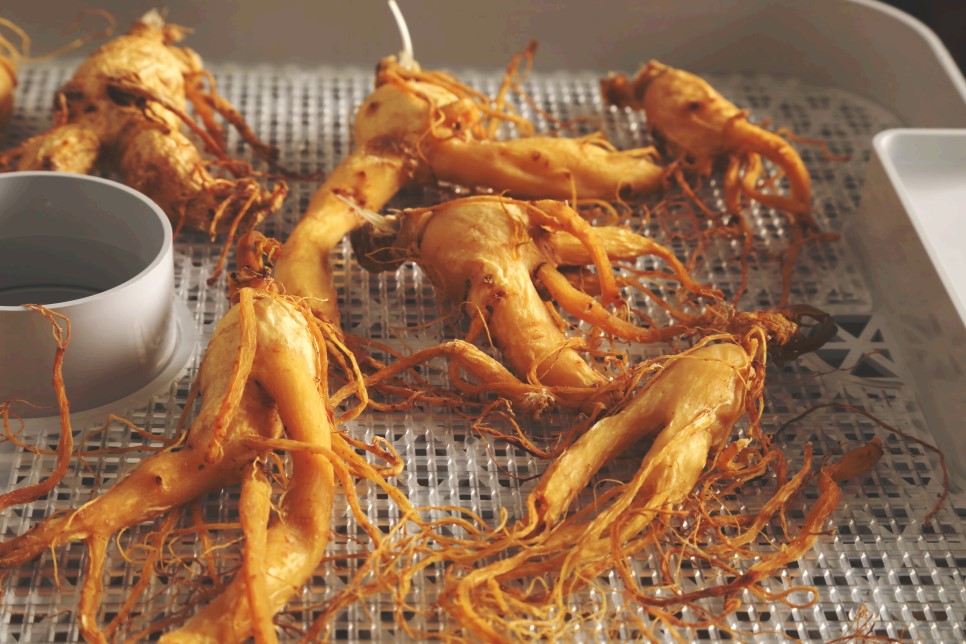 충분히 쪄진 인삼은 색이 노르스름하고 살짝 붉은 기가 돌기 시작하는데 이때 꺼내어 살짝 식혀야 합니다. 이 상태에서 바로 건조하면 겉은 마르는데 속은 수분이 남아 고르게 건조되지 않아요. 그래서 반건조 상태가 되도록 통풍이 잘 되는 곳에서 2~3일 정도 말려줍니다.